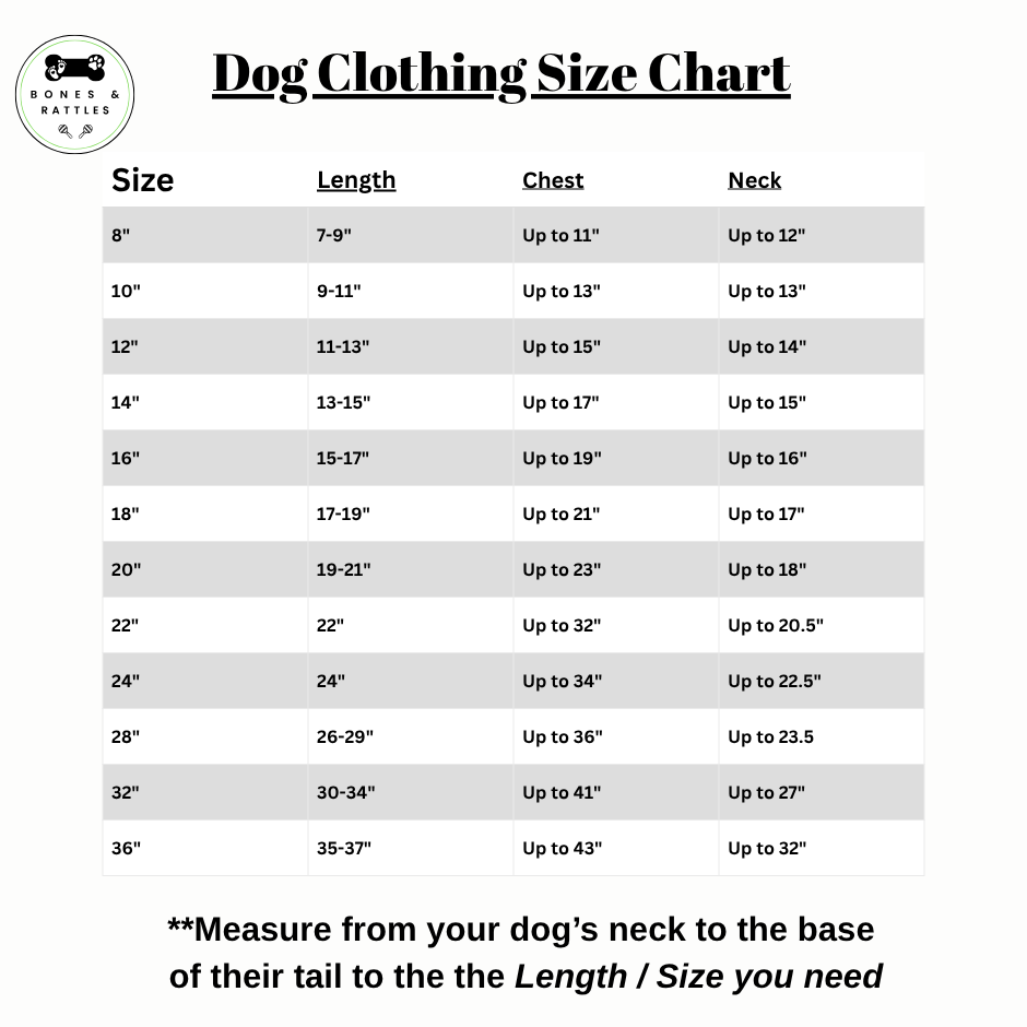 - Sizes are the length of the dog in inches from the base of the neck to just before their tail.